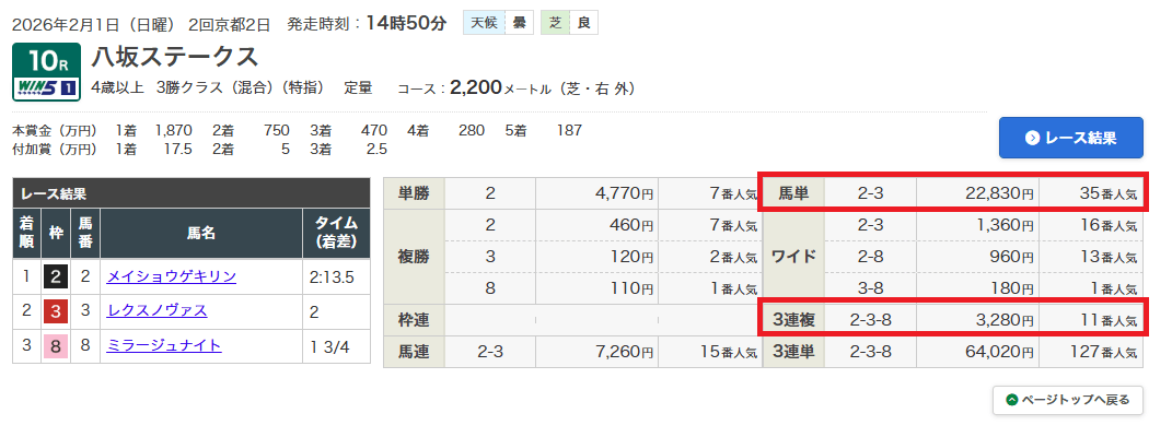 2月1日(日)2月一発目の競馬開催となったこの日、シルクロードS(G3)&根岸S(G3)開催前の京都10Rで重賞掛金に使える軍資金を届けた万馬券無料予想で大勝利!