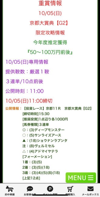 まじでエグイ的中貰えました!! リポートの管理人さんもLINE限定のガチ予想で京都大賞典3連複当ててたけど上位互換といってもおかしくない3連単予想でブチ当ててました、競馬好きな人とか競馬関係に携わってるとこんな大荒れレースさらっと当てるんかい?! 470万5500円ものちょー大金ゲットです! 追記、普段やらないけど土曜日キャリーオーバーしてたWIN5は馬蹄さんの予想に乗ったディープモンスターだけ当たりました(笑) 御見それいたしました、